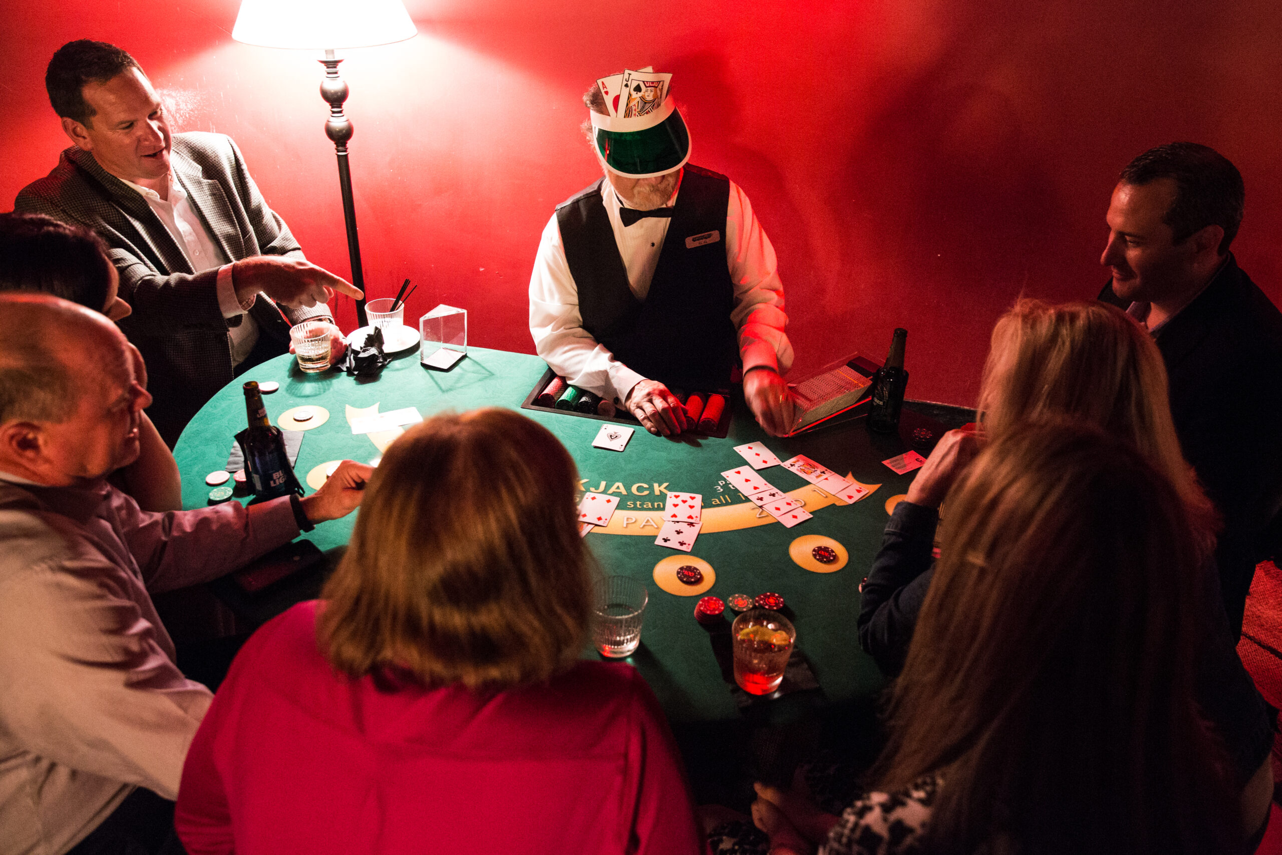 At the far end of the vault, a “brick wall” blocked entry to a secret room. A Capone-era gangster stood guard, demanding a password to access the hidden speakeasy, where guests discovered Vegas-style blackjack and roulette tables, dealers in green visors, and a private bar. The crowd laughed, mingled, and leaned fully into the Roaring Twenties fantasy—thankfully without any raids from the “men in blue.”