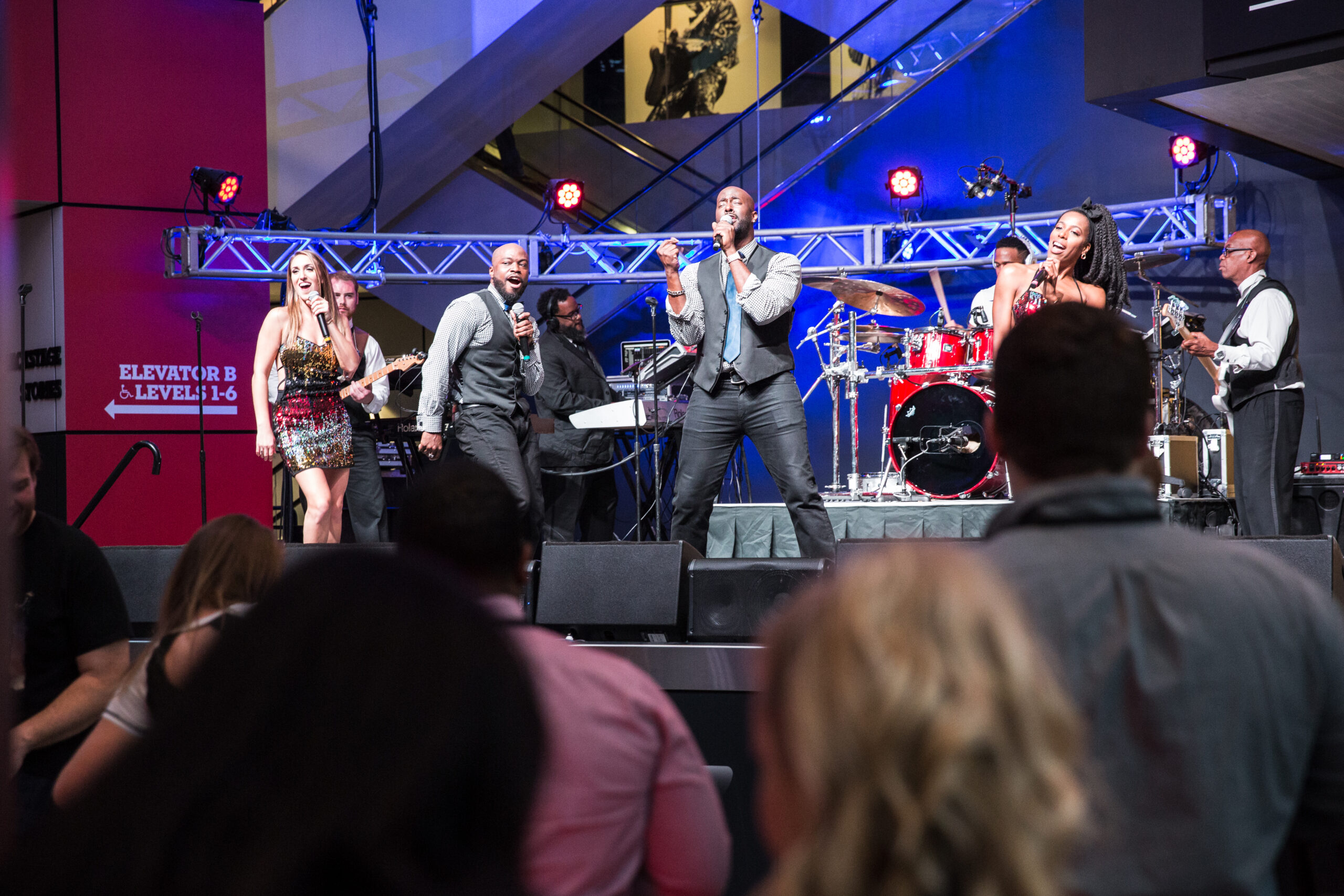 As attendees filtered inside, the real magic began. Simply Irresistible kicked off a three-hour continuous set of Motown, R&B, classic rock, and Top 40 anthems across two floors of the museum. Multiple bars and food stations kept guests moving between Hall of Fame exhibits while the band delivered a powerhouse performance.